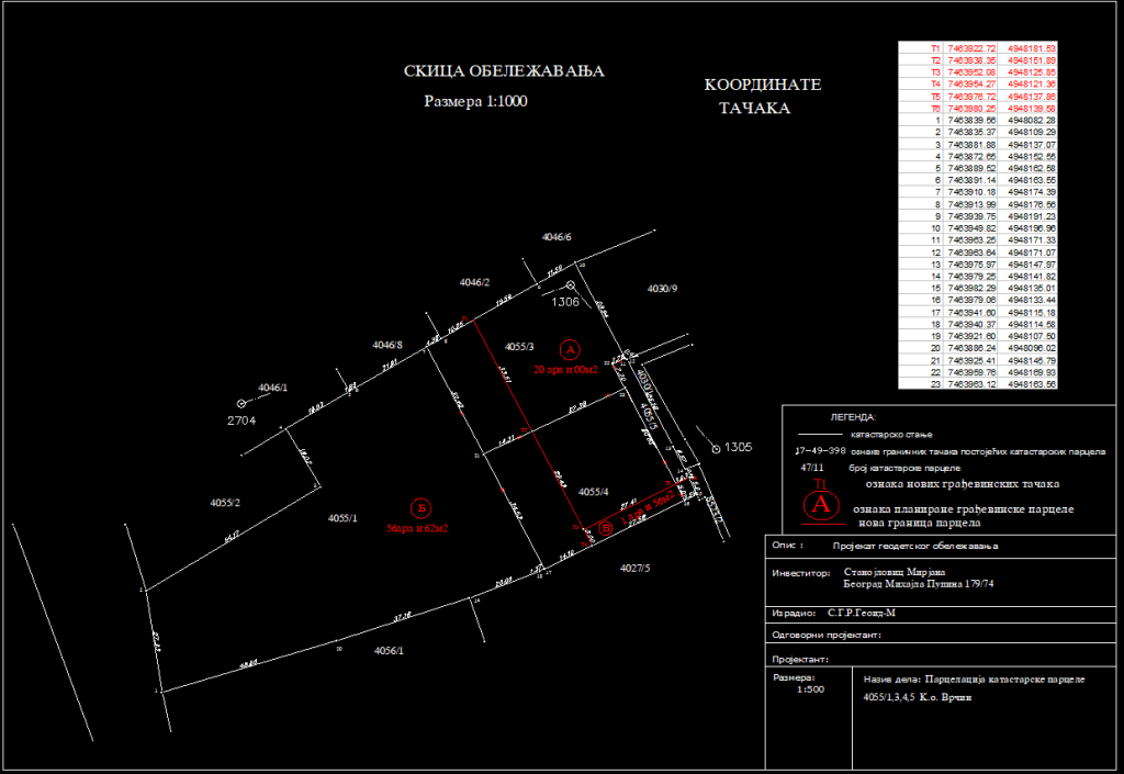 Parcelacija i formiranje građevinske parcele: Kada se izvadi informacija o lokaciji i kada se ustanove uslovi za parcelaciju prvo su vam potrebni saglasnosti svih suvlasnika na parceli, zatim su vam potrebni elaborati projekat parcelacije (Urbnanista), Projekat geodetskog obležavanja, Katastrasko topografski plan a kada se dobije potvrda parcelacije iz opštine onda se radi elaborat geodetskih radova za dobijanje novih građevinskih parcela.